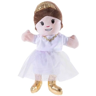 Princess; hand toy doll; white dress with tulle; golden shoes; brown hair; tucked face; plush toy, Manufacturer: HEUNEC