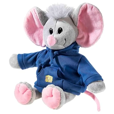 Mouse "Kati Cheese" made of synthetic plush, plastic eyes, embroidered cheese cube on blue hoody, Manufacturer: HEUNEC