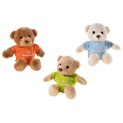 3 small bears; print: My miracle bear, beige bear with light blue shirt, light brown bear with green shirt, dark brown bear with orange shirt, plush toy, Manufacturer: HEUNEC