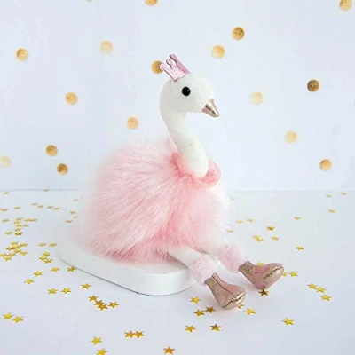 A beautiful and irresistible pastel pink swan keychain! Created in an exceptional plush quality with a long and dense pile, it impresses with its elegance and touches of pink glitter and girly gold. Small princess crown on the head, fine tulle flange, with its neat and fashionable design, it is a very friendly gift idea. For ages 24 months and over. Washable at 30 °C.