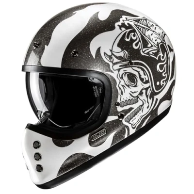 HJC V60 Flame MC5 Full Face Helmet – Black / White The HJC V60 Flame MC5 combines classic retro styling with modern technology and excellent comfort. The lightweight AFC fiberglass composite shell offers an optimized CAD shape for great fit and reduced weight. Ideal for riders who want vintage design with contemporary safety and comfort features. The integrated clear inner visor deploys quickly and provides sharp vision for everyday riding. The breathable interior wicks moisture efficiently and dries fast. Thanks to eyewear-friendly channels, the helmet is suitable for riders who wear glasses. Additional safety is provided by the emergency cheek pad system, allowing the pads to be removed quickly in critical situations. Features: AFC fiberglass composite shell – lightweight, strong & comfortable Classic retro design with modern functionality Integrated inner visor (clear, anti-scratch coated) Moisture-wicking & quick-drying interior Removable & washable crown and cheek pads Interchangeable cheek pads for all sizes Emergency Kit: cheek pads for quick removal in critical situations Eyewear grooves – ideal for riders with glasses Safety: ECE 22.06 certified Closure System: Double D-ring Included: Helmet peak Important: Helmets shown with tinted or mirrored visors come with a clear visor as standard.