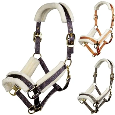 Luxuriously designed halter with striped straps Soft faux fur under the headpiece Noseband and cheek straps The halter is adjustable on both sides