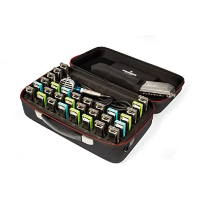 FlexCase XL is a durable suitcase that can accommodate numerous harmonicas in various setups; up to 48 diatonic harmonicas, 30 diatonic plus two three-octave chromatic or 30 diatonic plus one four-octave chromatic harmonica Protects each harmonica individually against scratches or dents A detachable tool bag allows players to remove the tools to take the instruments as a carry-on when traveling by air An adjustable shoulder strap makes carrying your instruments comfortable and easy Easily see an overall view of all the harmonicas and accessories stored in the case