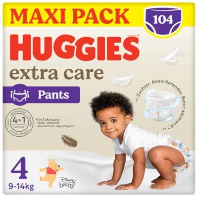 ULTRA ABSORBENCE: Size 4Huggies Extra Care nappies are our most breathable panties, with 10,000 micropores that facilitate perspiration and keep skin dry, avoiding irritation CHANGE INDICATOR: With the soft elastic waistband and wet indicator that helps you know when it's time to change your diaper. GOOD FIT: Easy to put on and take off, making changing easier and faster. DERMATOLOGICALLY TESTED: Hypoallergenic and dermatologically tested. Approved by the Dermatest Research Institute after a test on 35 subjects after 6 weeks of use. May 2020 PACKAGE: This item contains a pack of 26 nappies panties