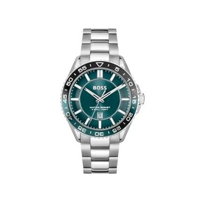 AmazonTHREE-HAND MOVEMENT WITH DATE – FUNCTIONAL AND FRESH – The BOSS Runner 3H features a clean three-hand layout with date window at 6 o’clock, combining clarity and style. 43MM STAINLESS STEEL CASE – ROBUST AND SPORT-READY – A brushed and polished case offers bold proportions and a durable foundation for an active lifestyle. GREEN SUNRAY DIAL WITH CD-CUT RING – VIBRANT AND MODERN – The dial combines a green sunray finish with a CD-cut outer ring, luminescent hands, and applied indexes for bold contrast. STAINLESS STEEL BRACELET WITH POLISHED CENTER LINKS – STRUCTURED AND EYE-CATCHING – A 3-link bracelet in stainless steel adds contrast and shine with its polished central elements. 5 ATM WATER RESISTANT – BUILT FOR EVERYDAY VERSATILITY – Splash- and rain-resistant. Not suitable for showering, swimming, or submersion.