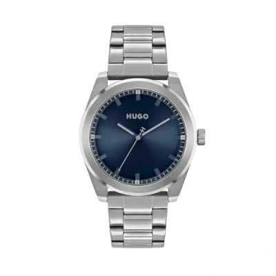 3-Hand Precision: Elevate your everyday style with this watch's vibrant and unisex design, featuring a 3-hand quartz movement for precise timekeeping. Tailored for the young and the young at heart, it's the perfect accessory for a chic and versatile look. Case thickness 9.6mm / Case Diameter 42mm Blue Brushed Dial: Elevate your style with the circular brushed blue dial of this watch, proudly featuring raised HUGO branding and color-filled brushed hands. 316L Stainless Steel Bracelet: Durable and stylish, the watch boasts a meticulously crafted 316L stainless steel bracelet, combining style and resilience for a quality wristwear experience. Water Resistance: 5ATM It may be worn while showering or swimming, but not scuba diving