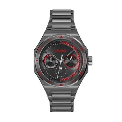 Multifunction Quartz Movement for Precision and Style The #GRAIL Sport for Him collection from HUGO Watches features a multi-function quartz movement, providing optimal precision and convenient sub-dials for a dynamic and versatile experience. 44mm Automobile Inspired Case Unique Shape A bold 44mm case, with a distinctive and exclusive shape, as well as the HUGO branding engraved on the side, embodies sporty inspiration while combining classic design with modern style. Black Dial with Red Details and Elegant Sub-Dials The brushed circular finish black dial features a molded reflector ring, striking red details, and three distinctive sub-dials at 3, 6 and 9 o'clock, adding depth and character to its sporty aesthetic. Stainless Steel Bracelet with Grey Ionic Plating A stainless steel bracelet with grey ion plating completes the bold and contemporary look of this watch, ideal for men who assert their personality with an original and unexpected style. Water resistance: 5 ATM. Can be worn when showering or swimming, but not suitable for scuba diving.