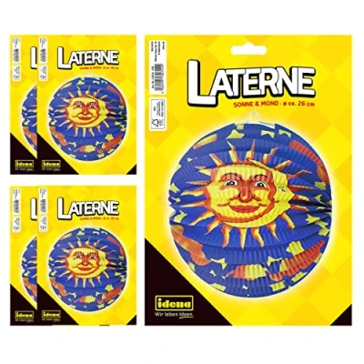 Lantern set from Idena in the motif "Sun and Moon" Included are 5 round lanterns with a diameter of approx. 26 cm The lanterns are FSC mix certified - promotes good forest use (FSC C112861) With the help of the wire bracket on the top, the lanterns can be easily attached to a lantern rod Ideal for the Martin's parade, the summer party or as a bright decoration in the children's room, Manufacturer: Idena