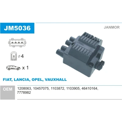 JANMOR Ignition Coil, model - JM5036. Order from Trodo only for 25.09 EUR. Fast worldwide delivery within 3 to 5 business days. Produced for: FIAT, LANCIA, OPEL, VAUXHALL.