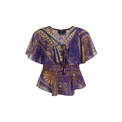 Silky shiny shirt blouse Delicate, semi-transparent material Print with gold metallic threads Renaissance Animal Print V-neck with tie band
