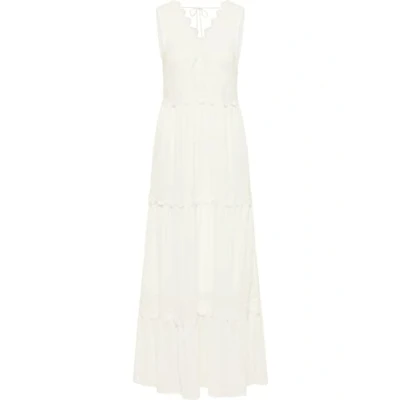 maxi dress with lace Loose flowing material Low back plunge with ribbon Tiered silhouette With inner lining