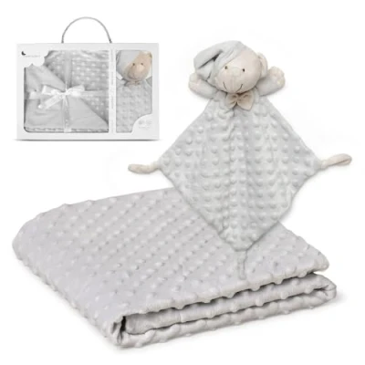 Baby Gift Set: Bubble Blanket and Dou Dou Teddy Bear Grey Dou dou: 28 x 17 cm. Blanket size: 80 x 110 cm. Velvety touch - Composition 100% polyester microfiber The baby gift set comes in a perfect gift box for babies, babies and toddlers.