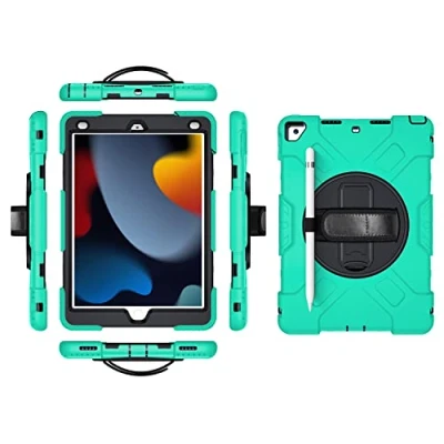 360° Rotating Wrist Strap & Shoulder Strap & Swivel Stand: The adjustable wrist strap helps you hold your tablet with ease, as soft and comfortable as your grip. You can get landscape view or vertical view as needed. 3 Layers Durable Protection: Flexible outer silicone with rigid PC inner shell and top PC frame provides protection for your tablet. The outer silicone layer is very thick and soft to absorb shock from accidental drops or shock. The case gives you easy access to all buttons, controls and ports without having to remove it from the case, the bumper guard keeps you away from bumps, and the port covers of the case keep dust away from the tablet. The integrated pen holder offers new accessibility features. Cutouts provide easy access to the new features of the tablet screen/charging port/speaker. SOFT WRIST STRAP AND SWIVEL STAND - Provides the safest protection and more comfort when you play or work with your iPad. Enjoy better entertainment and free your hands. The 360 degree rotating stand provides multi-angle viewing with a soft grip tape, making it easier to use your iPad when you are out and about, working and playing with your kids.