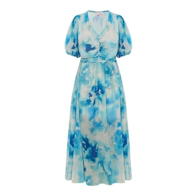 Trendy tie dye pattern Plunging V-neck with buttons Tie waist Short wide sleeves Inner lining shorter than the dress