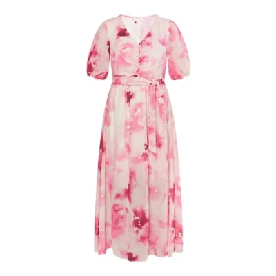Trendy tie dye pattern Plunging V-neck with buttons Tie waist Short wide sleeves Inner lining shorter than the dress