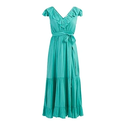 Ruffle Maxi Dress Made from soft viscose V neck with ruffle Plunging back plunge Smocked waist with belt