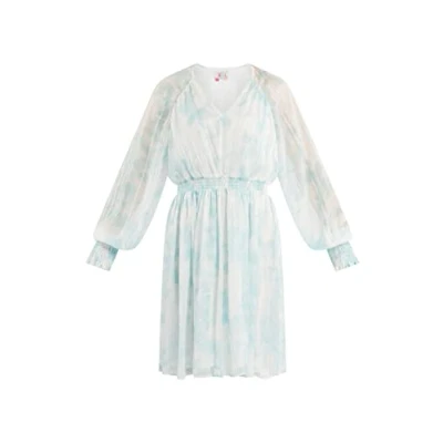 Tie Dye Print Mini Dress Gold thread Semi-transparent sleeves Feminine V-neck Smocked waist and cuffs