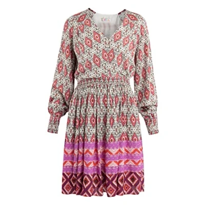 Midi dress with all-over print Colourful ethnic print Made from soft viscose Long sleeves with smocked ends Smocked waist