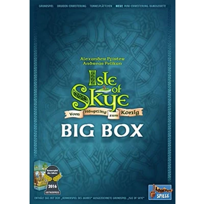The Isle of Skye board game appears in a big box that contains the basic game, the expansion Druids, the mini expansion edge areas and additional scoring and tunnel tiles In the competitive connoisseur game, you slip into the role of a leader of one of the five traditional Scottish clans. Fight for supremacy and become the king of the Isle of Skye Secretly determine for which price you want to offer your drawn tiles. A high price can lead to prosperity and the money needed. If no buyer finds himself, you make losses Strategic planning of your realm and a clever tactic when trading will be beneficial to you and bring victory points. But each game requires different tactics and strategies 2-5 players | Ages 12+ | 90 minutes playing time per game | Authors: Alexander Pfister and Andreas Pelikan | Game in German, Manufacturer: Lookout