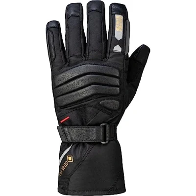 iXS Sonar-GTX 2.0 Glove black Touring glove made of goatskin and textile mix Safety: EN 13594:2015 Knuckle padding made of shock-absorbing Impacton® Visco-Elastan foam with Leather cover Reflective print on index finger and cuff Leather palm with Clarino overlay Ball of the hand with leather doubling and padding Leather doubling on the fingertips Features: GORE-TEX® membrane with tri-fleece lining Rubber lip on left index finger for wiping off helmet visor Wrist stretch with Velcro adjuster and TPR closure Width-adjustable cuff with Velcro closure Index finger tip with touch screen compatible material Water barrier at cuff end Material: Leather upper: goatskin Textile upper: 100% polyamide Textile 2 upper: 100% polyester Sidewall finger: 92% polyamide, 8% spandex Lining: 100% polyester Lining cuffs: 100% polyamide Knuckle padding: 100% polyurethane GORE-TEX® membrane 100% polytetrafluoroethylene