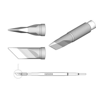 Compatible with the JBC T210-A Precision Handpieces Soldering Tip Shape/Size: Knife Shape - 3.4mm(0.134"Inch) x 0.3mm(0.012"Inch) C210 cartridges are appropriate for precision soldering jobs with medium power requirements Due to the size, these cartridges are perfect to work with SMD, under a microscope, or with conventional components Authentic JBC Soldering tips/cartridges last 5 times longer than other brands thanks to the JBC Most Efficient Soldering System and the Sleep & Hibernation features