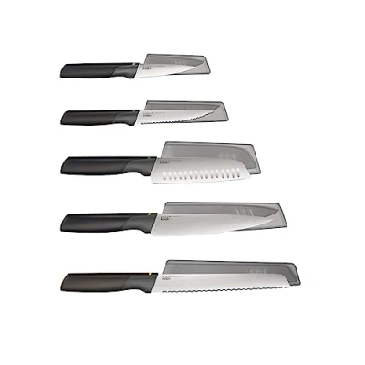 Set includes: 3½” (9 cm) Paring knife, a 4½” (11.4 cm) Serrated knife, 5½” (14 cm) Santoku knife, a 6½” (16.5 cm) Chef's knife and an 8” (20.3 cm) Bread knife Japanese stainless-steel blades Weighted handles and integrated tool rests improve hygiene and minimise mess Protective storage sheaths, Weight: 1.05 pounds, Manufacturer: Joseph Joseph