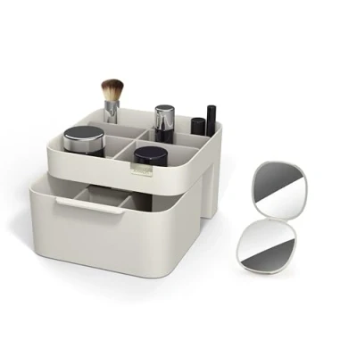 Organiser perfect for storing a wide variety of items such as brushes, mascaras and eye-shadows Drawer with magnetic closure for cotton wool pads, cotton buds and make-up sponges Mirror provides distortion-free view of whole face 3x magnifying mirror for finer detail Soft silicone finger/storage strap Included components: joseph joseph make me up compact mirror and cosmetic organiser set