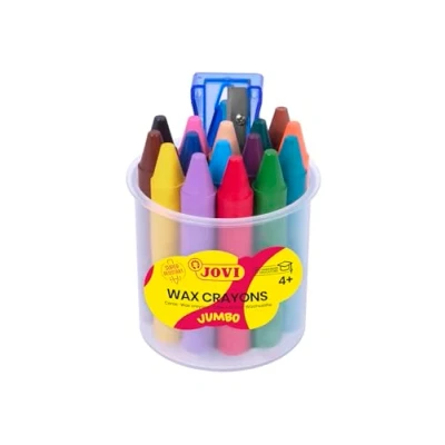 The Jovi Jovicolor wax painters glide very easily over the paper leaving a soft and homogeneous stroke. Ideal for shading and colour mixes by painting over The very good covering wax crayons are suitable for all ages and due to their slightly thicker shape, ideal for toddlers in kindergarten or students in primary school The pens do not break when they fall off and are easy to sharpen so they are very durable and will give you long-lasting enjoyment when painting The colouring pens are odourless and do not leave stains on the hands. Stains on textiles can be easily removed by hand washing with soap Box contents: Jovi Jovicolor wax pencils in 16 different colours in a closable plastic cup including 1 sharpener