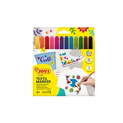 With the Jovi textile markers in many vibrant colours, you can personalise fabrics and clothing. With safe water-based ink, suitable for ages 5 and up Ideal for permanent decoration for light fabrics of all kinds (t-shirts, cloth bags, shoes, etc.). To fix first, let dry for 30 minutes, then iron inside out for 3 minutes Machine washable up to 40 °C, so that the personal unique items last for a long time The brush tip has a diameter of 4.8 mm. This allows you to draw thin or thick strokes and create true works of art Box contents: 12 Jovi textile markers with reversible cap, in bright trendy colours, delivered in a lockable cardboard box