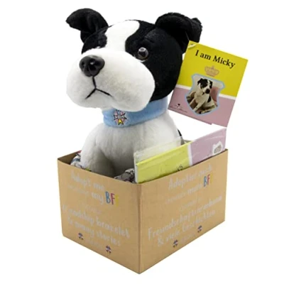 Mickey is a plush reproduction of a real dog rescued from the street by Maja Princess of Hohenzollern. The cuddly plush is approx. 18 cm high and comes in a gift box along with a plush bracelet for your new best girlfriend/boyfriend. There is also an illustrated booklet with the true stories of the saved animals, written by Maja Prinzessin von hohenzollern herself. Adopt a plush toy and be inspired by the true stories. The collar and bracelet carry the crest of the Princess Hearts Pets collection. The Princess Heart Order was designed by Maja Princess of Hohenzollern for little girls. All plush toys are PETA vegan classified. The book is two-part in Deustch and Romanian., Manufacturer: Joy Toy