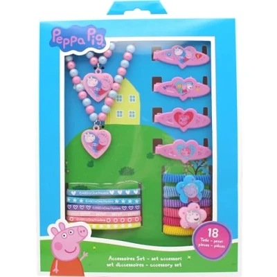 Peppa Pig Accessory Set Contains 18 pieces Box contents: 1 x bracelet, 1 x necklace, 4 x clips, 6 x hair clips, 6 x elastic bands in a gift box measuring 18.5 x 2.5 x 23.5 cm Comes in a gift box 18.5 x 2.5 x 23.5 cm A lovely gift for a Peppa Pig fan