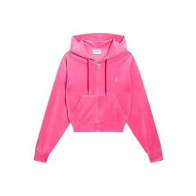 Cropped & Oversized, casual fit for fashionable comfort Elegant velour fabric: classic Juicy Couture material in hot pink Brilliant details: Diamante JC logo on front, iconic Juicy logo on the back Functional features: Kangaroo pocket, ribbed cuffs and hem Signature Hardware Silver Effect J Hinge