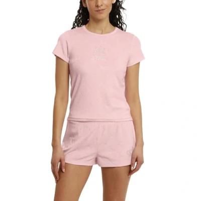 Juicy Couture Women's 2 Piece Velvet Fleece Short Sleeve Shirt and Pajama Shorts Lounge Sleepwear Set (US, Alpha, X-Large, Regular, Regular, Candy JC Embossed)