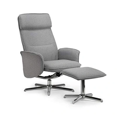 Upholstered in a grey linen fabric with a chrome base. Featuring a padded headrest and footstool for extra comfort. Not only does this chair recline, it also swivels Perfect match for a wide range of modern décor. 12m product guarantee