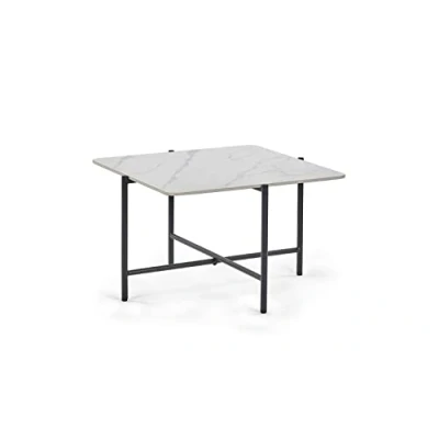 Beautiful white marble effect finish. Crafted from high quality sintered stone providing a durable and high quality products. Contrasting black legs make this piece stand out in your home. Suited to any modern house/apartment. Height: 12.5, Width: 77.5, Depth: 78.5