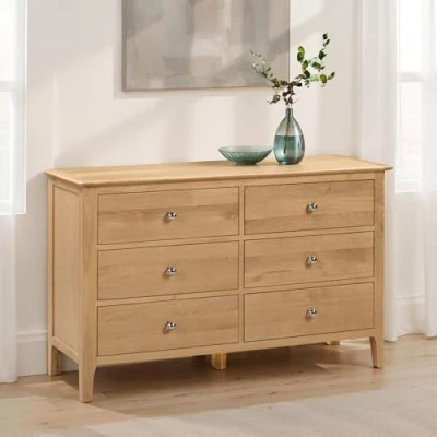 Crafted from solid oak and oak veneers, this frame ensures long lasting durability. Round silver knobs. Featuring 3 spacious drawers. Part of the Julian Bowen Cotswold Bedroom Collection. Height: 65cm, Width: 45cm, Depth: 38cm