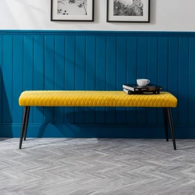 Classic Style with a modern twist. Upholstered in luxurious mustard velvet fabric with quilted detailing. Contemporary black painted legs. Perfect for any dining area or a striking focal point for any room. Height: 47cm, Width: 140cm, Depth: 37cm