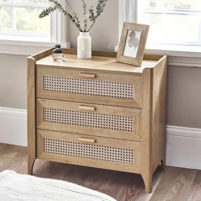 A beautifully sleek design with a bohemian feel Featuring exquisitely curved edging with a raised lip allowing you to store your products safely Rattan-effect sticker front Three storage drawers H 75 x W 80 x D 41cm