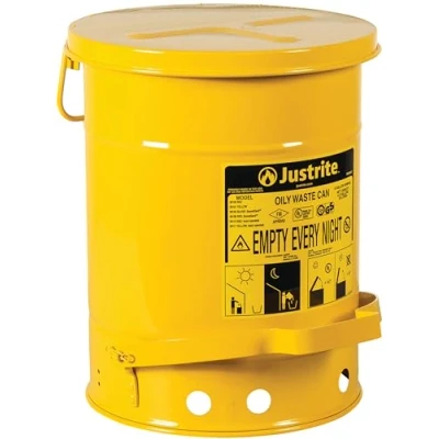 Justrite 6 Gallon Galvanized Steel Oily Waste Can, 16" x 12" Metal Oil Rag Safety Can With Foot Operated Self-Closing Lid for Oil Rag Disposal, Made in the USA, Yellow, 09101