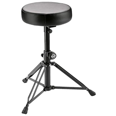 Sturdy, professional drum throne with foldable 3-leg base Made of steel 2-piece folding design Available in black leather Spring-loaded bolt and locking screw
