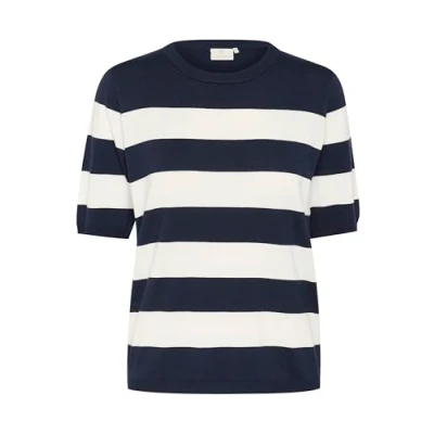 KAFFE Women's Pullover Crew Neck Short Sleeves Regular Fit Horizontal Stripes, Midnight/Chalk Wide Stripe, M