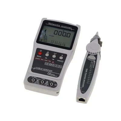 A comprehensive tester with a professional finish. Combines the advantages of a multimeter with those of a network tester. Thanks to its VFL function, it can test both RJ45 copper and fiber networks. Multimeter. Measures AC and DC voltages and currents, resistances, diodes and continuity. Also measures temperatures. Tests continuity, mapping of RJ45 cables. For CAT5/6 cables, checks UTP/STP cordsets, indicates discontinuity wire by wire, maximum length tested 3km. Displays the wiring diagram on its screen. You'll be able to see whether the cord is straight or crossed, for example, or whether one of the 8 wires of an RJ45 cord is cut or has a bad contact. Several scan modes available. Provides continuous fis resistance. Tests the length of RJ45 cables. Measures the length of a cable from one end to the other if the cable is functional, or from one end to the breaking point if a fault has been detected. Choice of two modes: Digital and Analog. Complete power supply test (PoE Power Over Ethernet). For power supplies from 5V to 60V and 0 to 18W. Identifies which contact is carrying the power supply, and provides information on voltage and wattage. Possibility of testing batteries using the same tool and the adapter supplied.