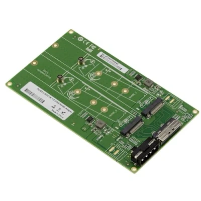 MCIO 8i (Mini CoolEdge IO) to 2 Slot M.2 Gen5 NVMe SSD Adapter Adds M.2 SSDs from an available MCIO port on the motherboard. The module uses Gen5 compliant connectors as well as very low loss PCBs. Compatibility: The plate has 2 M.2 connectors (75 pin M key, PCIe x4) for M2 SSD format 2230/2242/2260/2280 or 22110. Each SSD is connected to a PCIe Gen 5.0 x4 host interface (an allowed throughput of 16GB per M2 port). To be used connected to a motherboard whose BIOS will have to support PCIe bifurcation mode. Support 2 NVMe M.2 PCIe 5.0 SSD Compatible with multiple SSD formats: 2230, 2242, 2260, 2280, 22110. Features a 4-pin power connector, accepting 12V or 5V input. Requires a motherboard or expansion card with MCIO (x8) port that supports PCIe bifurcation. MCIO-8i 74 pin connector. Operating temperature: 5 to 50 °C. Size: 145mm x 85mm Weight: 56 g. Supplied with screws for mounting SSDs.