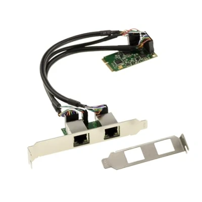 DUAL GIGABIT ETHERNET MiniPCIe card. Compatible with Windows 11, 10, 8, Windows 7 / Vista / XP / Server 2003-2008 32/64-bit, 2000, Linux, Mac OS/X 10.5, and DOS 6.22. MiniPCIe card sold with a two-port RJ45 daughterboard, with two brackets (low and high profile). This card connects to the miniPCIe card via three supplied cables. REALTEK RTL8111 chipset. Full-size format. PCI-E Base Revision 1.1. 2.5GBps bandwidth Compatible with PCI-E Mini Card Electromechanical specification revision 1.2. Plug and Play Ethernet 10/100/1000 BASE-T controller Auto negotiation, compatible with all Ethernet network speeds IEEE 802.3, 802.3u, 802.3ab and full duplex flow control (IEEE 802.3x) compatible IEEE 802.1P Layer 2 Priority Encoding compatible IEEE 802.1Q VLAN tagging compatible Supports 9K byte jumbo frames