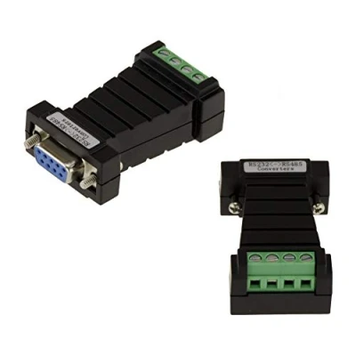 Connects an RS485 (wire-to-wire) device to an RS232 (DB9) port. Interface compatible with EIA/TIA RS-232C and RS-485 standards. RS-232 side: DB9 female connector. RS-485 side: terminal block for A, B, V- and V+ connections. Operates in Asynchronous Half Duplex mode Transfer speed from 300 to 384000 bps. Maximum transmission distance 1200m (RS-485) and 5m (RS-232).