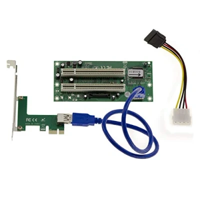 To be able to use a PCI card on a PCI Express port 1x to 16x!. Useful for recycling your PCI cards to a new computer. Chipset ASM1085. Compatible with PCI 2.2 bus. Choice of intensity by 5V or 3.3V power supply: PCI 16-bit (3.3V) and PCI 32-bit (5V) compatible. Maximum throughput on PCI 66MB/S ports. Power recovery via SATA power plug to connect to PC central power supply (Molex/Sata adapter included). Slots for attaching the adapter with screws and adhesive pads included. USB 3.0 50cm 5GBps cord link (you can use a longer cord if you wish). Standard bracket (High Profile) with slot for the passage of the USB3 cable. Plate size with 2 PCI ports is 130mm x 55mm Recognized by all OS, no driver needed for the adapter itself which is totally "passive".
