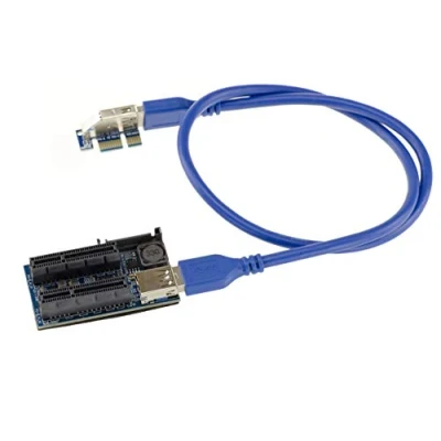 This adapter works like a multiple socket, allowing you to use one PCIe x1 slot to obtain 2 x4 slots. With ASM1182e chipset. The base fits into a PCI Express 1x, 2x, 4x or 16x slot on a server or desktop PC. The daughterboard, connected to the base by a 60cm cord, features 2 PCIe 4x ports that you can use independently. You can replace this cable with a longer or shorter one, as it's a simple USB3 type A male / A male cable (but beware of its quality if you want to replace our supplied cable!). If you need a large power supply for the PCIe ports, you can use the Sata connector to connect the daughterboard to the PC power supply. Gold-plated contacts (better connectivity due to resistance to oxidation over time).