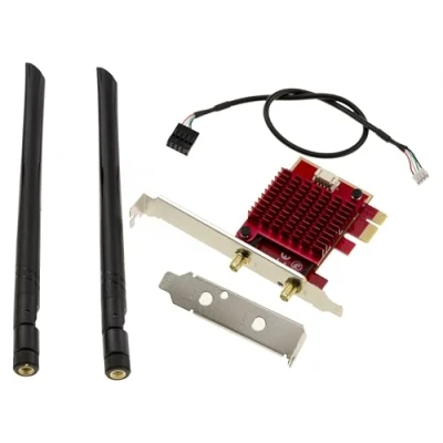 Mounts on a PCIe x1 slot to create a wireless communication point, using both WiFi 6 and Bluetooth 5.1. For PCIe 1x slot (fits 1x, 2x, 4x, 8x and 16x slots). Automatic installation under Windows 10 and 11 (32/64). IEEE 802.11ax Wi-Fi CERTIFIED support 6. 2x2 Wi-Fi 6 support. Support for UL and DL OFDMA, 1024QAM, Target Wake Time (TWT), WPA3. Data rates of up to 2.4 Gbps. Support for Wi-Fi networking and BLE HID connectivity in UEFI environment at boot. WIFI Miracast support (for video streaming). Bluetooth 5.1 support. Intel vPro and Intel Active Management support. Board supplied with two 5dB antennas, a cable for connection to internal USB port (for Bluetooth), and two low and high profile brackets.