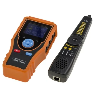 Mapping and localization. Test UTP cable sequence, type and length, quickly detect and locate (in distance from origin) points of failure. Displays wiring diagram on screen. Test cable type: twisted pair RJ45, telephone line RJ11, BNC cable, etc. Determine the fault point on the RJ45 cable connector using the LOCAL/DISTANCE LED. RJ45 TDR test: Test cable pair condition, length, attenuation, reflectivity, impedance, inclination, etc. Maximum distance 180M.. Coaxial Test: HD coaxial video level meter, can detect TVI/CVI/AHD/CVBS signal peak value, SYNC value and burst value. PING test. Checks whether the Ethernet port of an IP camera or other network device is functioning normally, and whether the IP address is correct. IP Scan: Quickly finds the IP address of an IP camera or other connected network device. Flashing and locating port. Simulates activity on a cable and flashes the LEDs on switches or network cards to identify where the cable is connected. Thanks to the tracer supplied, you can locate a cable in a group of cables. Link Monitor. Identifies network speed and full/half duplex type.