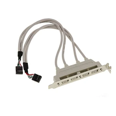 Transforms a motherboard's internal USB 2.0 connectors into usable USB 2.0 ports. Maximum transfer rate 480 MBps. 2 internal USB 2.0 Female connectors. 1 x 4 USB 2.0 type A ports (2 ports available for each internal port connected). Cord length between 9-pin plug and angle: 25cm.